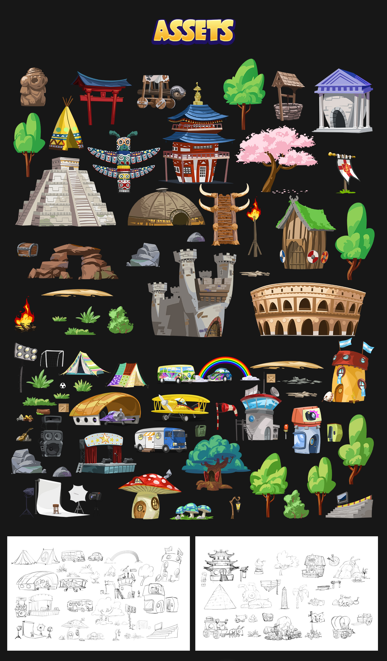 SKETCH, COLOR, CHARACTERS, ASSETS AND BACKGROUND DESIGN.